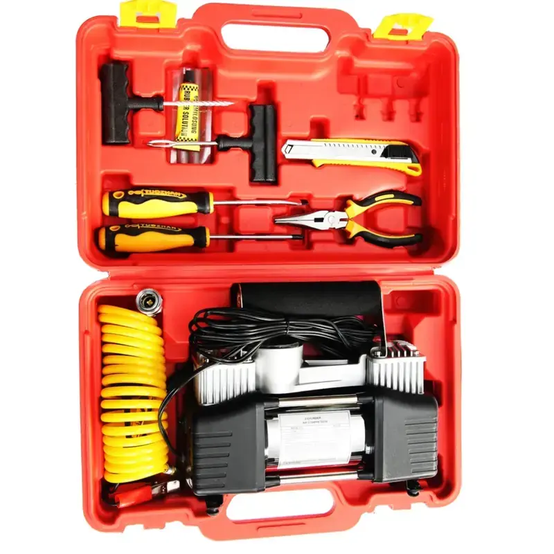Moćan set za krpljenje 12V – Ovaj komplet spaja snažan kompresor sa duplim cilindrom, digitalni manometar i praktičan set za krpljenje guma, smešten u izdržljiv kofer za teren i servis. Predviđen je za kombije, džipove, traktore i veće mašine, gde je potrebno pouzdano i brzo pumpanje, kao i efikasna popravka probušenih pneumatika odmah. Napajanje preko upaljača ili direktno sa akumulatora pruža stabilan rad, dok digitalni manometar omogućava preciznu kontrolu pritiska u svakom trenutku tokom svake vožnje.