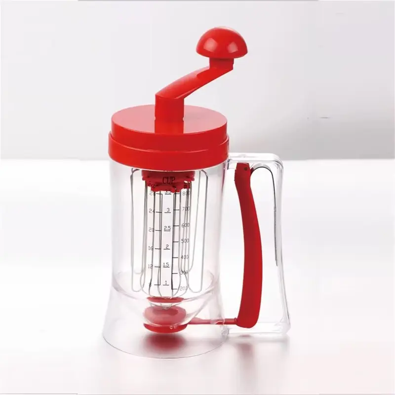 U jednoj posudi imate mutilicu, dozer i merni sud. Sastojke ubacite, umutite ručno, zatim pritisnete i sipate tačno koliko treba. Testo ide pravo na ploču, bez curenja okolo.