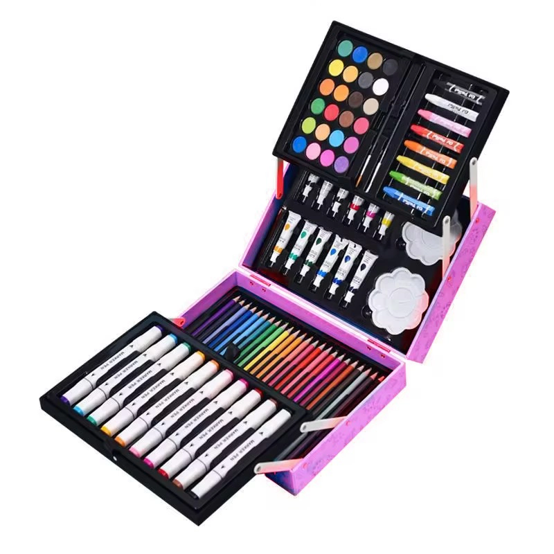 Set je pažljivo dizajniran kako bi obuhvatio različite vrste pribora: bojice, flomasteri, pastelne boje, olovke, gumice, rezači i još mnogo toga. Pogodan je za sve uzraste – od predškolaca do starije dece koja vole da crtaju i slikaju.